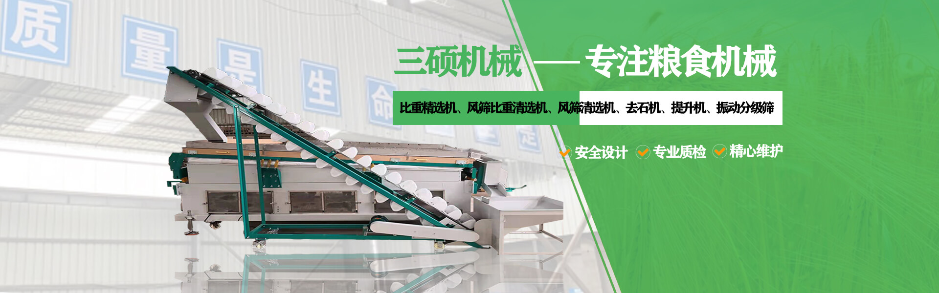 石家莊三碩機械設備有限公司是從事糧食清選、種子加工及其它農副產品選別的設備研發、生產、銷售和服務于一體的專業性新興企業。“品質、誠信、共贏”是公司的核心理念,“以人才為戰略條件、以品質為拓展基礎、以共贏為奮斗目標”是公司的經營理念。品質鑄就、誠信經營、不斷創新!三碩機械致力于為三方(供應商、生產商和使用商)收獲碩果、事業騰飛!歡迎有目標,能為目標而不斷努力! 公司位于石家莊市鹿泉區孟同工業園。交通便利。占地面積2000多平方米。質量是生命,安全是保障是公司的生產管理原則。生產材料不低于**標準。采用數控激光下料、數控折彎、噴塑表漆處理等工藝標準。我們將致力于打造品質保障、高效適用的產品和專業服務。 石家莊三碩機械設備有限公司,誠摯歡迎廣大新老客戶朋友咨詢和考察!